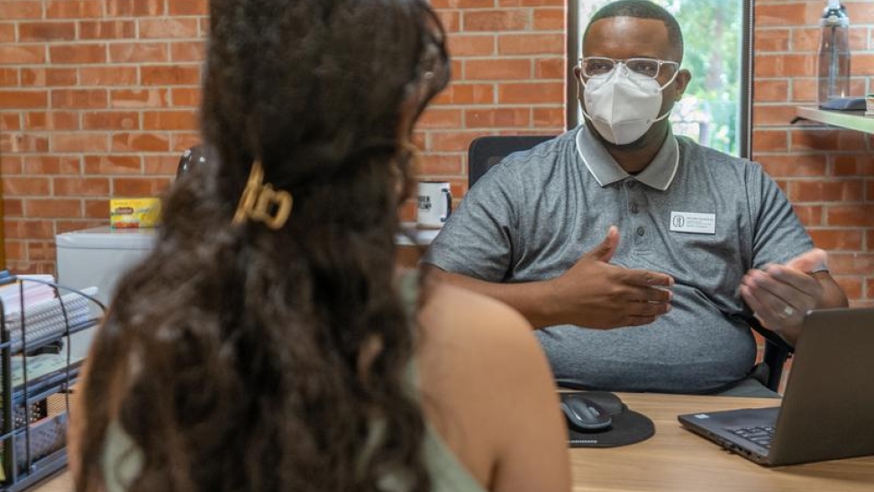 The first photo is of Sinclair Preston Ceasar III advising a student in his office. Academic advisers offer in-person and virtual options for advising.