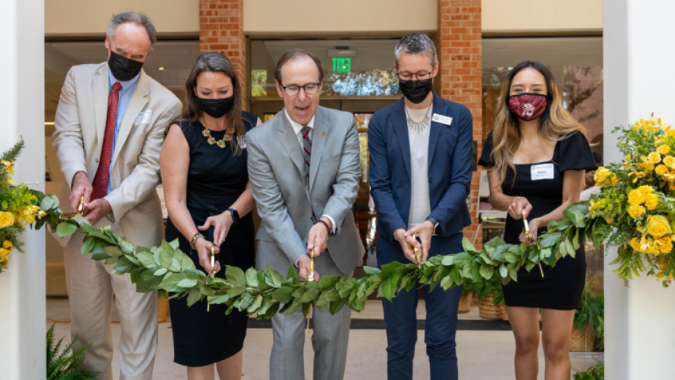 The first photo features (left to right) Trinity Trustee Herb Stumberg '81, Jackie Moczygemba of the Ewing Halsell Foundation, Trinity President Danny Anderson, Trinity Vice President of Academic Affairs Megan Mustain, and Trinity student Maria Arteaga '22 officially reopening the Halsell Center with a ribbon cutting.