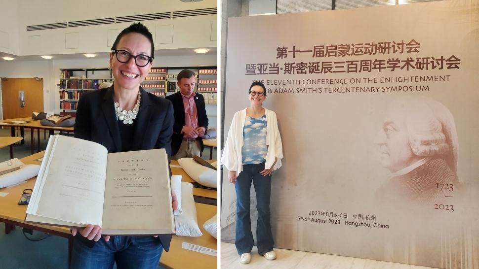 In the above image, Maria Pia Panagelli, Ph.D., holds the first edition of Adam Smith’s Wealth of Nations at the University of Glasgow in June 2023 (left), and she visits Hangzhou, China, for Adam Smith’s Tercentenary Symposium in August 2023 (right).