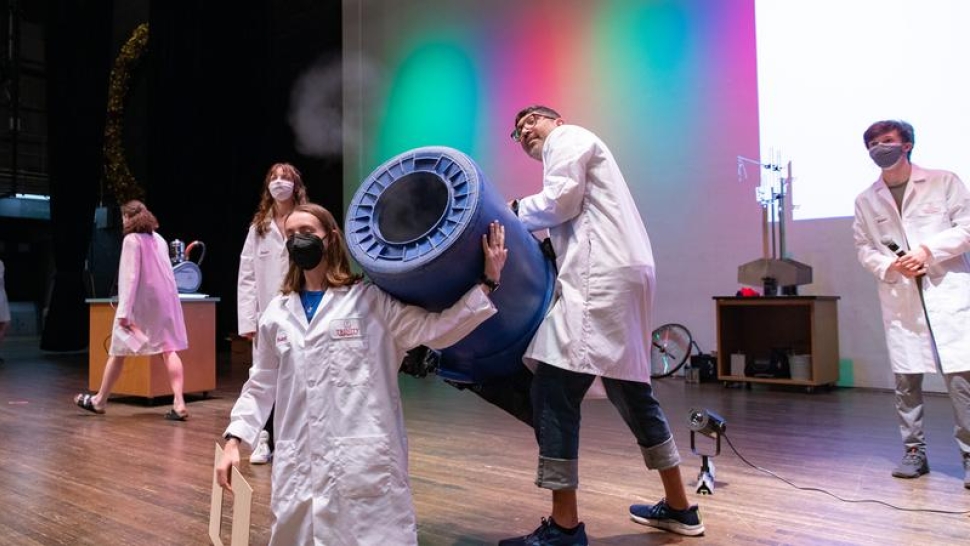 The stage show, held Friday, May 13 in an open performance to the Trinity community and the public, featured each member of Mehta’s class presenting an experiment.