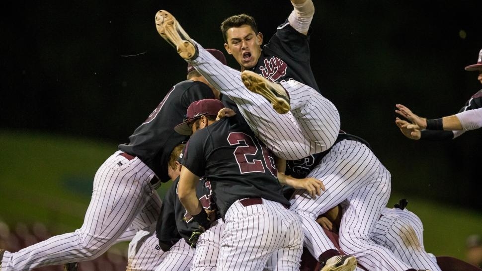 Austin Singer ’16 (top) celebrates with teammates after winning the 2016 NCAA title.
