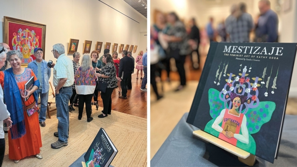 In the above image, Trinity University Press hosted an art exhibit in its Libros/Arte Gallery featuring art by Kathy Sosa from her book Mestizaje.