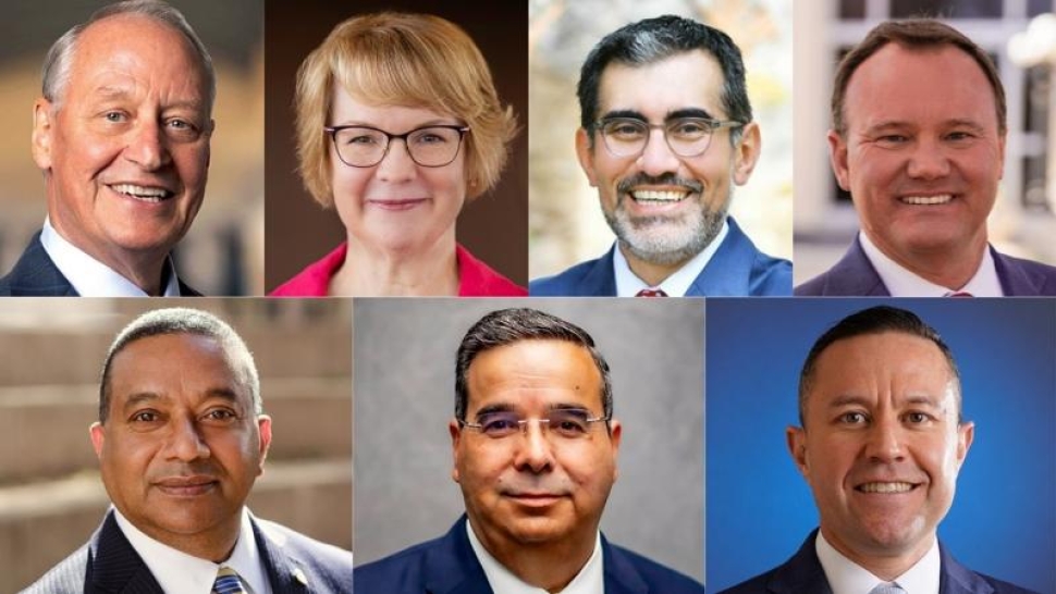 The above image is a collage of the San Antonio Report’s Higher Ed Presidents’ Panelists. Top row from left, UTSA president Taylor Eighmy, Trinity University president Vanessa Beasley, Alamo Colleges District Chancellor Mike Flores and UIW president Tom Evans. Second row, from left, St. Marys president Winston Erevelles, TAMUSA president Hector Ochoa and OLLU president Abel Chavez. Credit: Courtesy